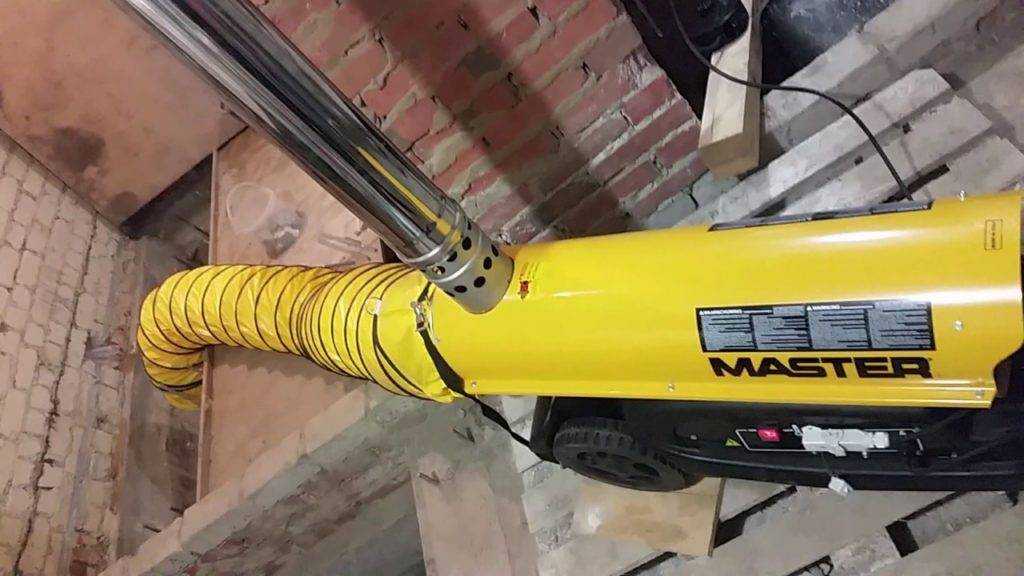 Есть газовые пушки без выхлопа. Вернее, выхлоп выводится из помещения через трубу. Устройство таких моделей более сложное. Камера сгорания — тот же цилиндр, вот только она герметична по отношению к помещению. В верхней части имеет выходной патрубок, через который удаляются продукты горения.