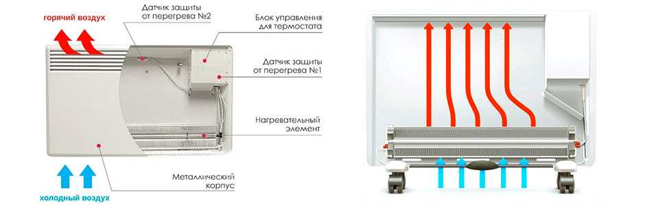 Электрический конвектор – это устройство, которое применяет этот принцип воздушной конвекции. Воздух нагревается при помощи электронагревателя и поднимается вверх. После охлаждения опускается вниз и снова оказывается в блоке нагрева конструкции. В этом заключается принцип его работы.