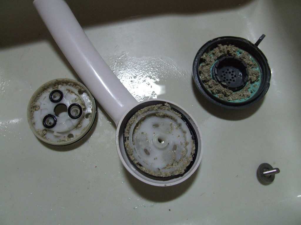 Падение давления из-за засора отверстий лейки. Открутите лейку от шланга. Прочистите и промойте отверстия. Часто они забиваются накипью. Если металлические элементы снимаются, их можно замочить в растворе лимонной кислоты.