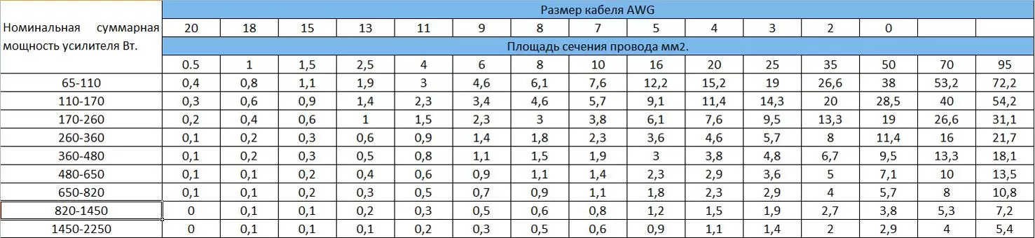 После проведения этих вычислений желательно также рассчитать и длину провода от АКБ до усилителя (обычно его устанавливают либо под сиденье, либо в багажник). А дальше, опираясь на собранные данные, нужно найти подходящее сечение кабеля в таблице. Слева в ней указана суммарная мощность кабеля, справа сверху — размер кабеля.