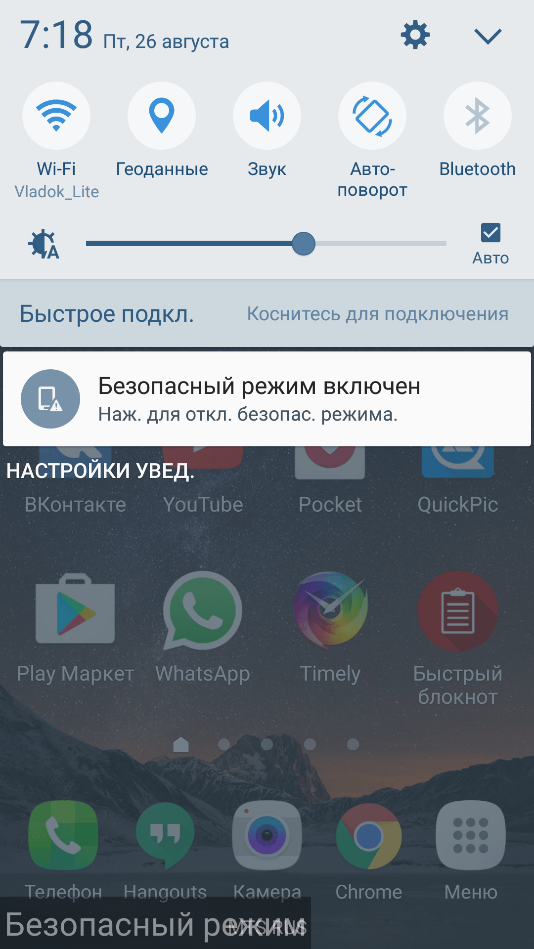 Некоторые пользователи интересуются и по поводу того, как отключить безопасный режим на Android. На самом деле сделать это гораздо легче, чем попасть в безопасный режим. Зачастую помогает выключение и включение аппарата. Также вы можете открыть панель уведомлений — наверняка в ней присутствует сообщение с предложением убрать безопасный режим.