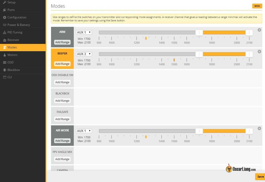 - Проверьте, настроен ли пункт ARM во вкладке Modes, должен быть выбран правильный канал (обычно это AUX1), а желтые ползунки расположены в правой части, определяющие положение переключателя. При перемещении переключателя в положение ON, нижний индикатор должен быть в зоне желтых ползунков.