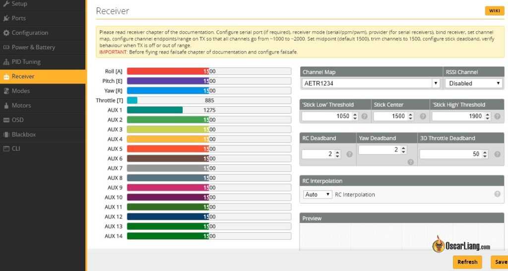 - Проверить, корректно ли работает приемник. Для этого нужно зайти в Betaflight во вкладку «Receiver» и подвигать стики пульта — каждое движение должно правильно отображаться на графике (должны двигаться полоски состояния).