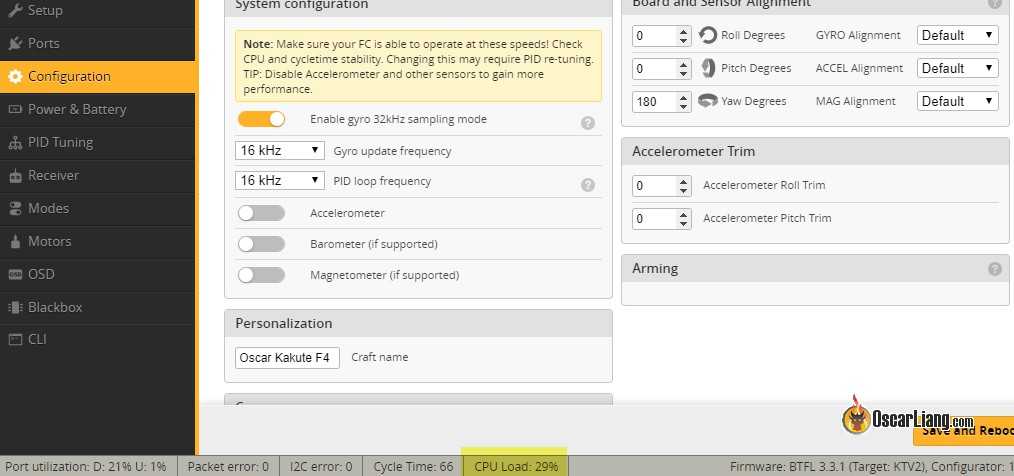 Если вы включили все что нужно и ненужно, то скорее всего, процессор будет загружен на полную. Отключите лишние функции и постарайтесь добиться загрузки процессора до 50%. В противном случае, при полной загрузке полетный контроллер запретит взлет.