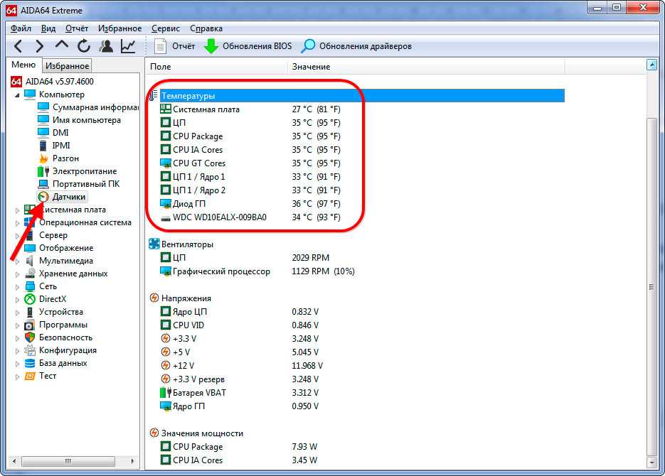 В первой разворачиваете ветку «Компьютер» и кликаете «Датчики».