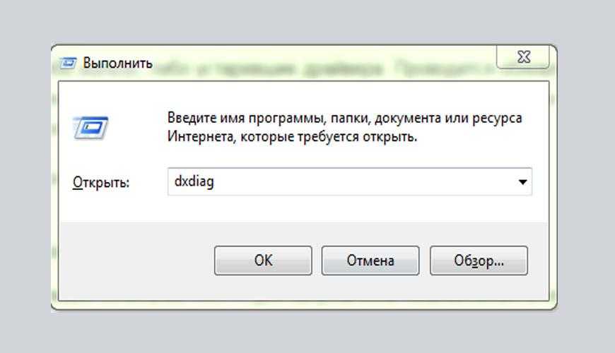 - Далее нажимаем сочетание Win+R для запуска окна «Выполнить», в котором набираем команду dxdiag.