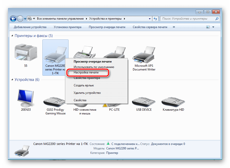 Перед вами отобразится окно, где найдите подключенный аппарат, кликните по нему ПКМ и выберите «Настройка печати».