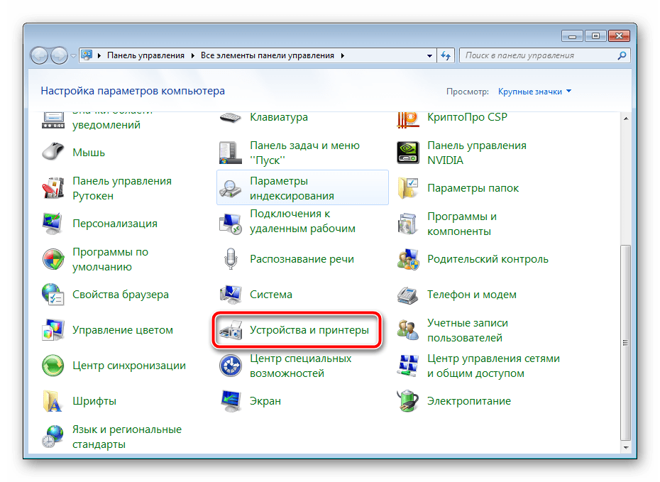 - В окне «Устройства и принтеры» выбирают подключенный к ПК прибор.