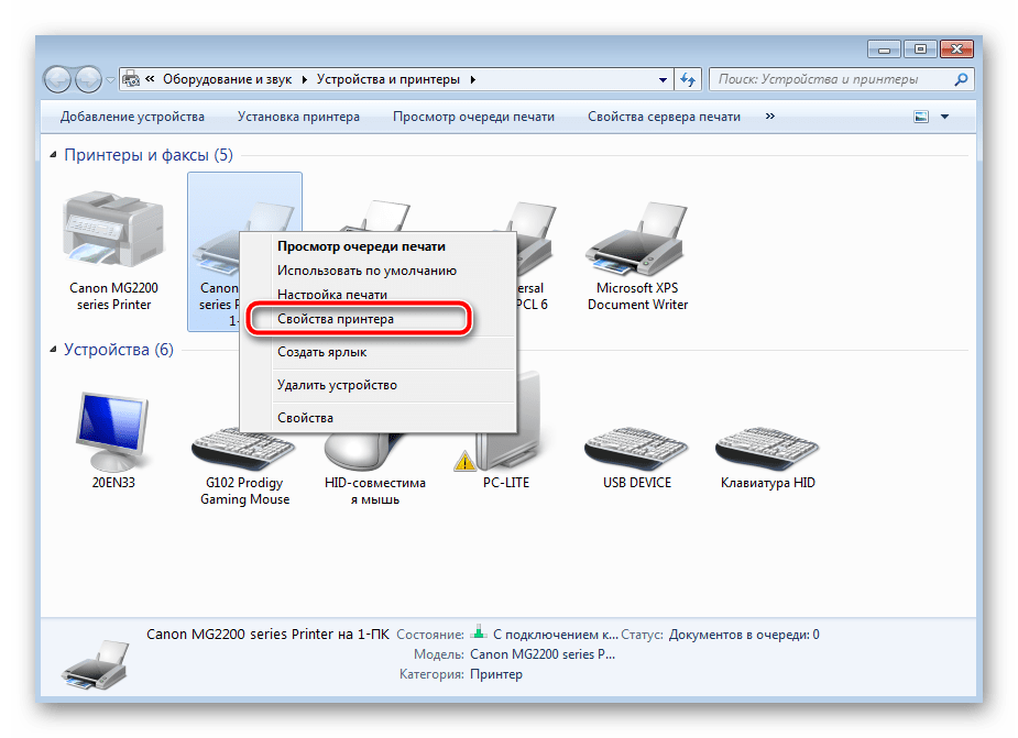 - Через «Панель управления» перейдите в меню «Устройства и принтеры», где кликните правой кнопкой мыши на подключенном аппарате и откройте «Свойства принтера».