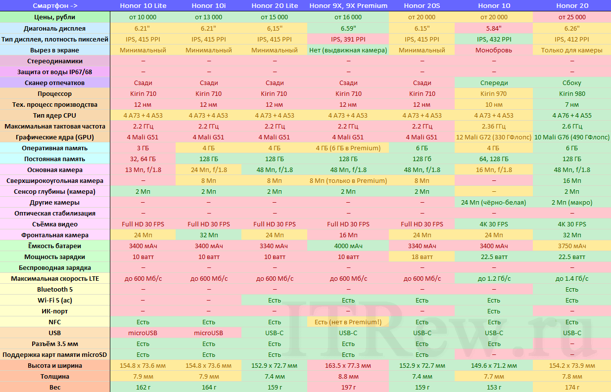 Сравнительная таблица Honor 20, 20 Lite, 9X, 20S и других Honor