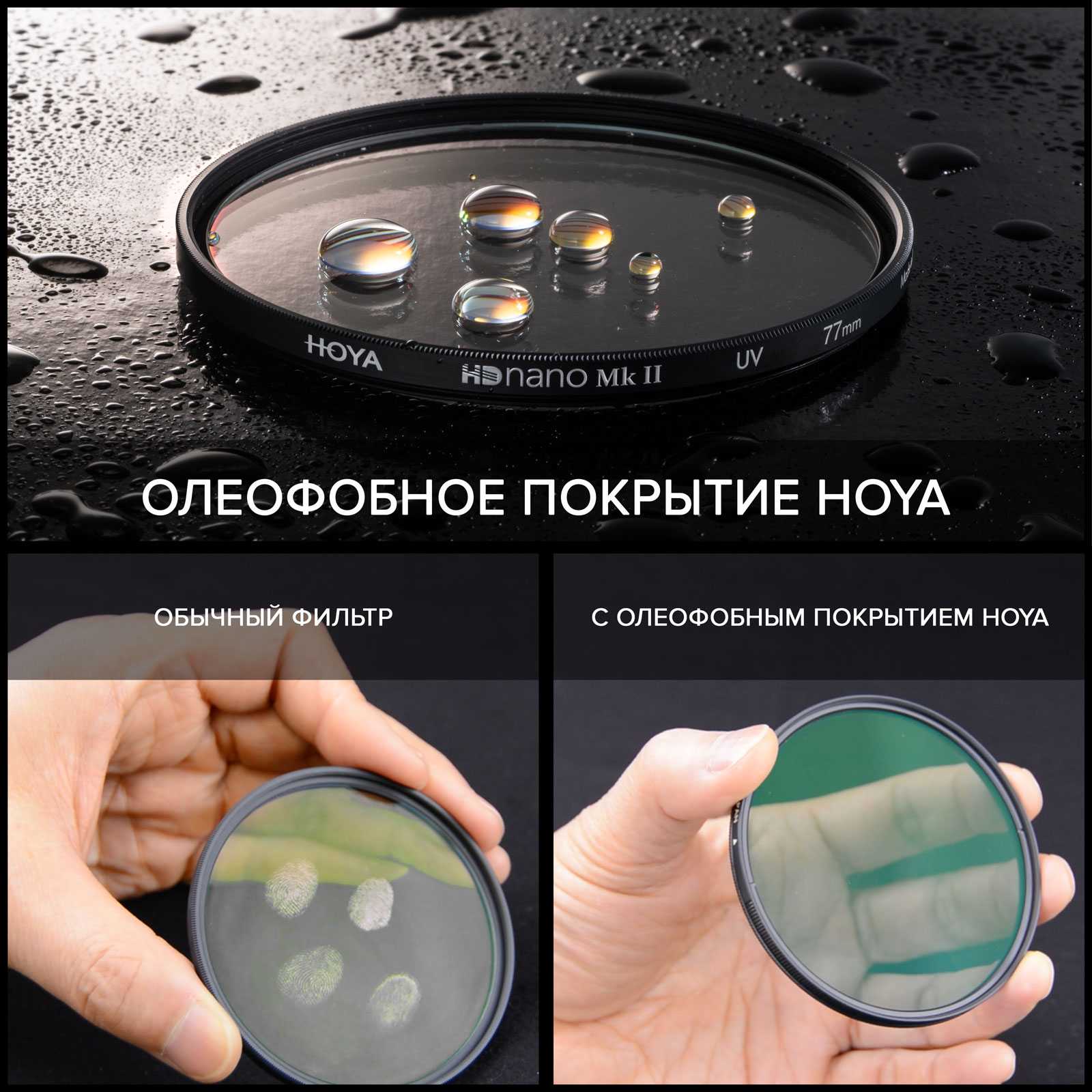 Олеофобное покрытие препятствует удержанию воды и жира на поверхности фильтра. Это позволяет легко стирать грязь или даже отпечатки пальцев. Покрытие также существенно упрощает процесс съёмки в сложных погодных условиях. Если же загрязнение происходит, то чистка поверхности такого фильтра занимает существенно меньше времени.