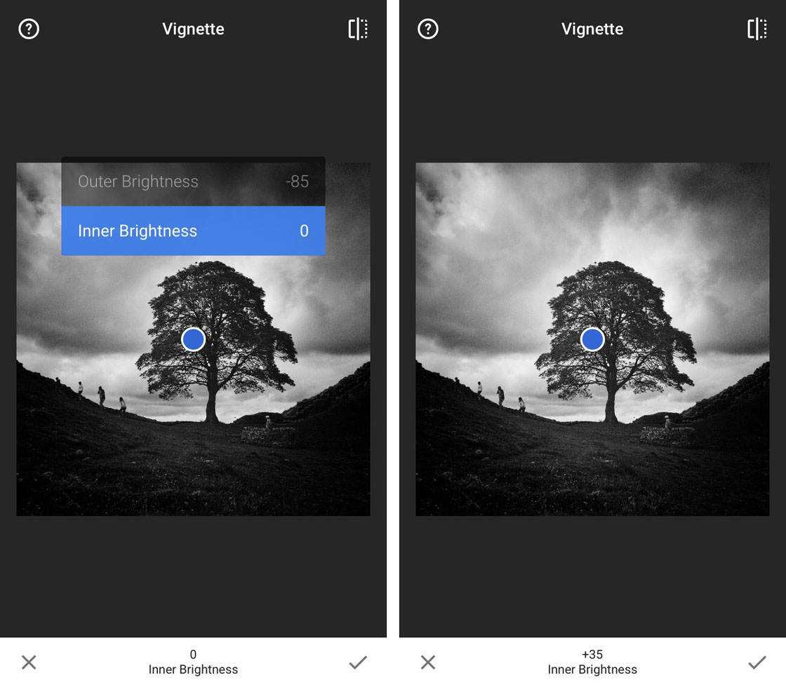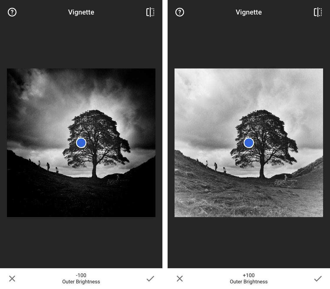 Чтобы сравнить виньетированную версию с оригинальным изображением, нажмите и удерживайте фотографию для просмотра оригинальной версии. Проведите пальцем влево, чтобы сделать виньетку темнее, или вправо, чтобы сделать ее светлее.