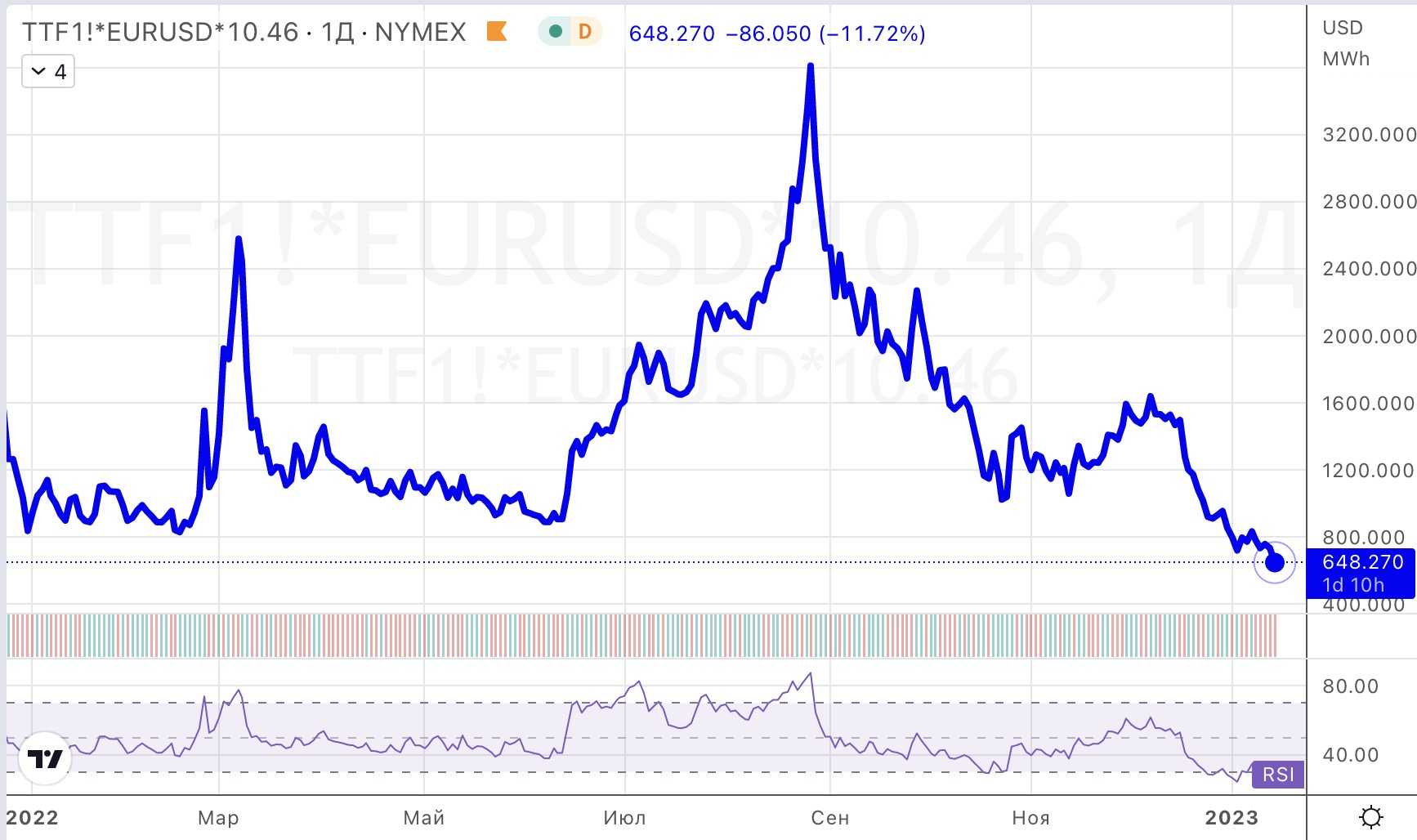 Однако зима началась аномально тёплой погодой, поставки СПГ из США и с Ближнего Востока, а также от Новатэка частично заместили трубопроводный газ. Цены к концу года ушли ниже $800 за 1 тыс. м3. Аналитики считают, что газа в хранилищах хватит до конца зимы.