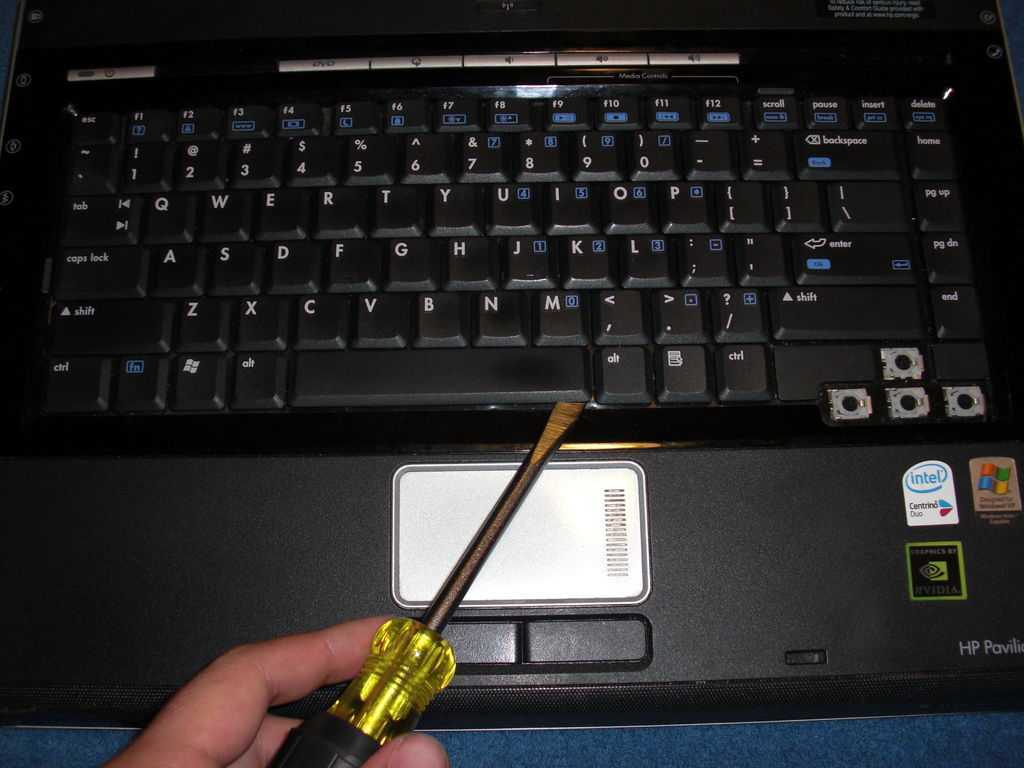 Вооружившись плоской тонкой отверткой, скальпелем или небольшим ножиком, аккуратно подцепить нижний край кнопки. Постараться рассмотреть, каким образом сделан крепеж. Затем несильно надавить (до щелчка) на «усики» крепления, вытягивая клавишу наверх. Действовать нужно без резких движений, чтоб не сломать «усики». Не рекомендуется снимать на ноутбуках клавишу пробела, Enter, Tab и Shift – закрепить их после очистки может быть проблематично