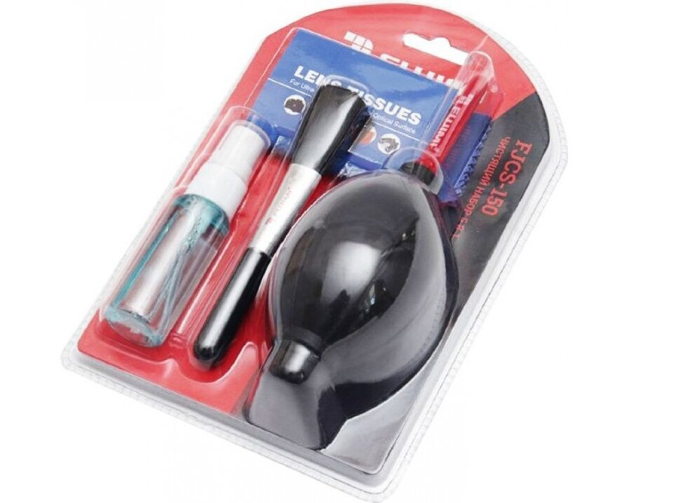 Многоразовый универсальный комплект для очистки оптики FUJIMI FJCS-150 включает в себя микрофибру (15х18 см), специальную кисточку, воздушную грушу, чистящую жидкость объемом 20 мл и сухие салфетки в количестве 25 шт. Набор подходит для всех видов фотоаппаратов, а также для видеокамер, экранов ноутбуков/смартфонов и др. Все инструменты имеют компактные размеры, поэтому их можно брать с собой в командировки и путешествия. Вот только чехол для хранения придется докупать отдельно.