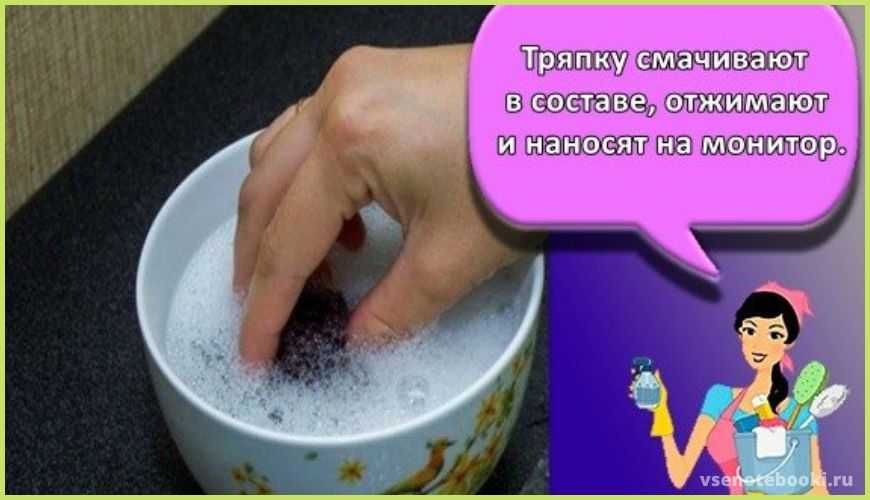 - Аналогичными свойствами обладает столовый уксус концентрацией 3—6%. Чтобы удалить с экрана загрязнение, приготовьте раствор. Смешайте 100 мл. фильтрованной воды с 10 мл. состава, окуните в средство ватный диск, проведите очищение. После проведения процедуры ЖК-монитор следует протереть сухой безворсовой тканью (подойдёт салфетка из микрофибры).