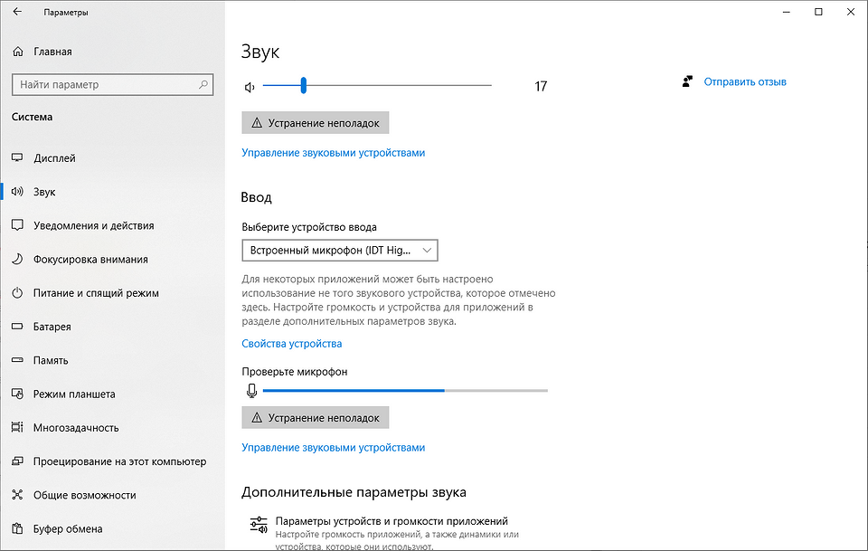 Теперь для проверки работы микрофона откройте еще раз меню «Пуск» и «Параметры» и зайдите в «Система». Здесь в левом меню найдите и кликните по разделу «Звук». Справа чуть промотайте вниз до раздела «Ввод» и вы увидите полоску с уровнем звукового сигнала, принимаемым микрофоном.