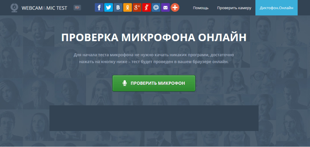 Чтобы проверить устройство записи достаточно всего лишь кликнуть на «Проверить микрофон» в правой верхней части экрана. После этого вам необходимо нажать зеленую кнопку в центре окна и начать говорить. Если вы видите колебания звука – значит, устройство работает правильно и проблема кроется в настройках вашего ПК.