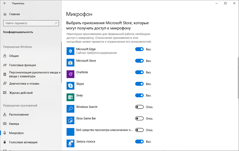 - Проверить, предоставлен ли доступ необходимой программе к микрофону. Если нет — включить его с помощью ползунков.
