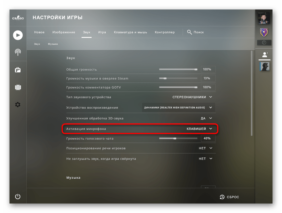 Если говорить об играх, то за пример предлагаем взять Counter-Strike: Global Offensive. В этом приложении микрофон активно используется в каждом матче, но его настроек не так много. Есть изменение типа активации и другие параметры, относящиеся к оверлею Steam. Предлагаем ознакомиться с инструкцией ниже, чтобы примерно понимать, как использовать девайс не только в КС, но и других играх, где он точно нужен.