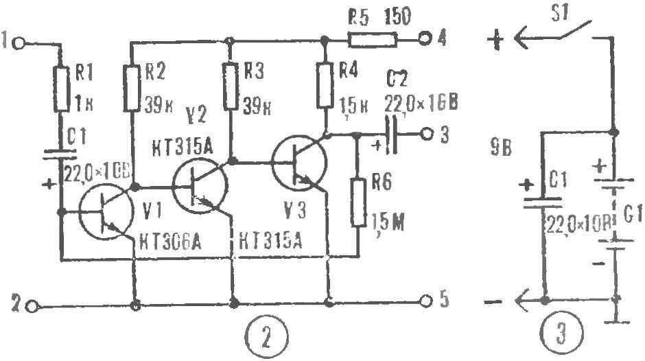 Входные Х1-Х4 и выходное Х6 гнезда — пятиштырьковые, а гнездо микрофона Х5 — трехштырьковое. Питается прибор ст шести сухих элементов по 1,5 В, зашунтированных конденсатором емкостью не менее 220 мкФ (рис. 3).