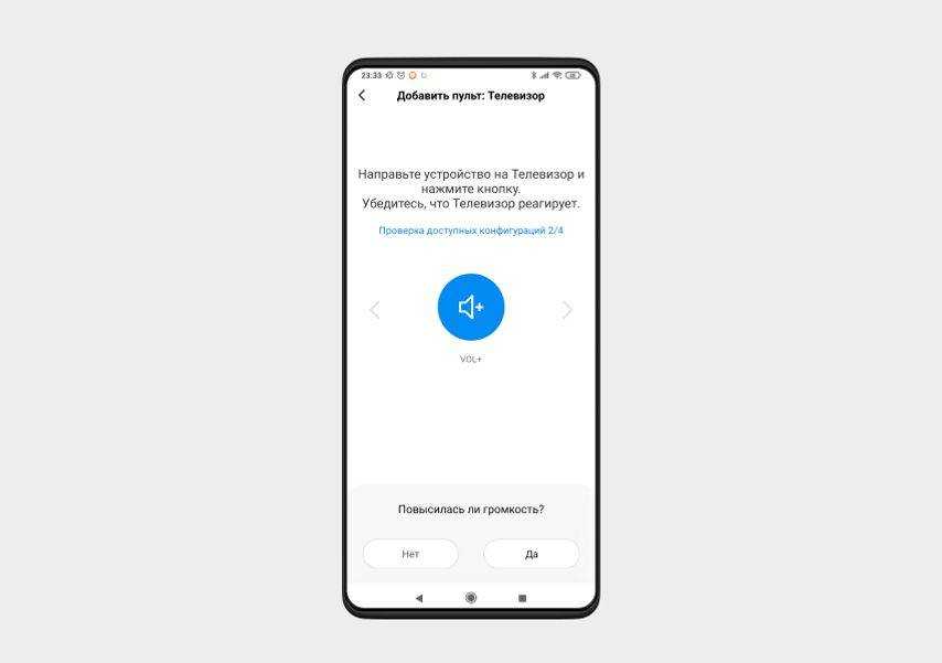 Приложение предложило повысить громкость. Если после нажатия на круглую синюю кнопку громкость на телевизоре увеличилась, подтверждаем. Если нет, выбираем «Нет», и приложение отправит новый сигнал.