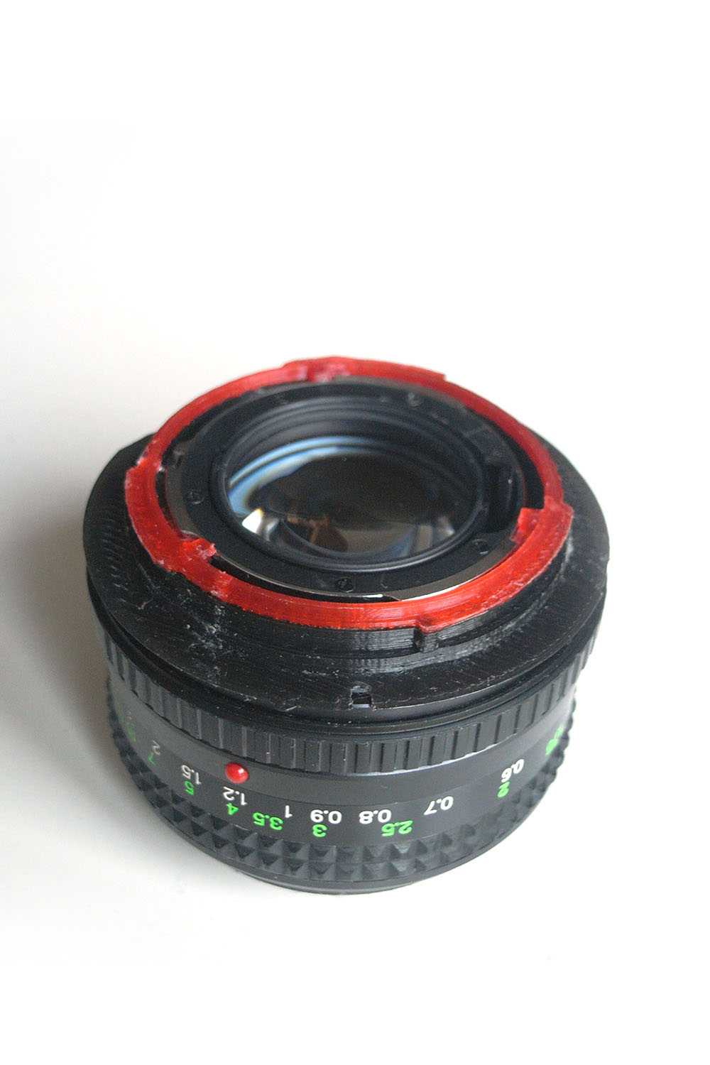 | Minolta MD Rokkor 50/1.4 with thin MD>EF adapter — EF mount lock cut out visible. |