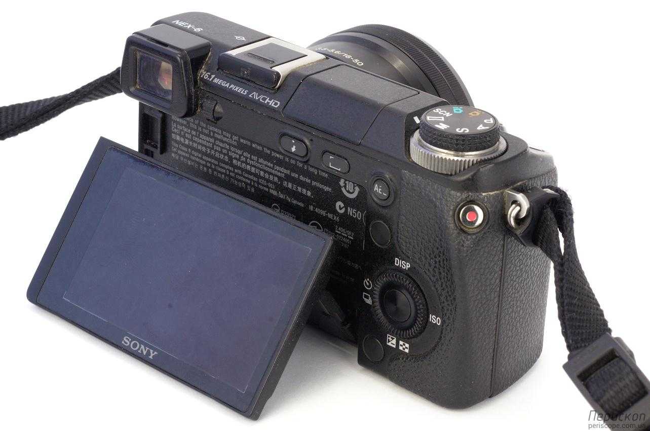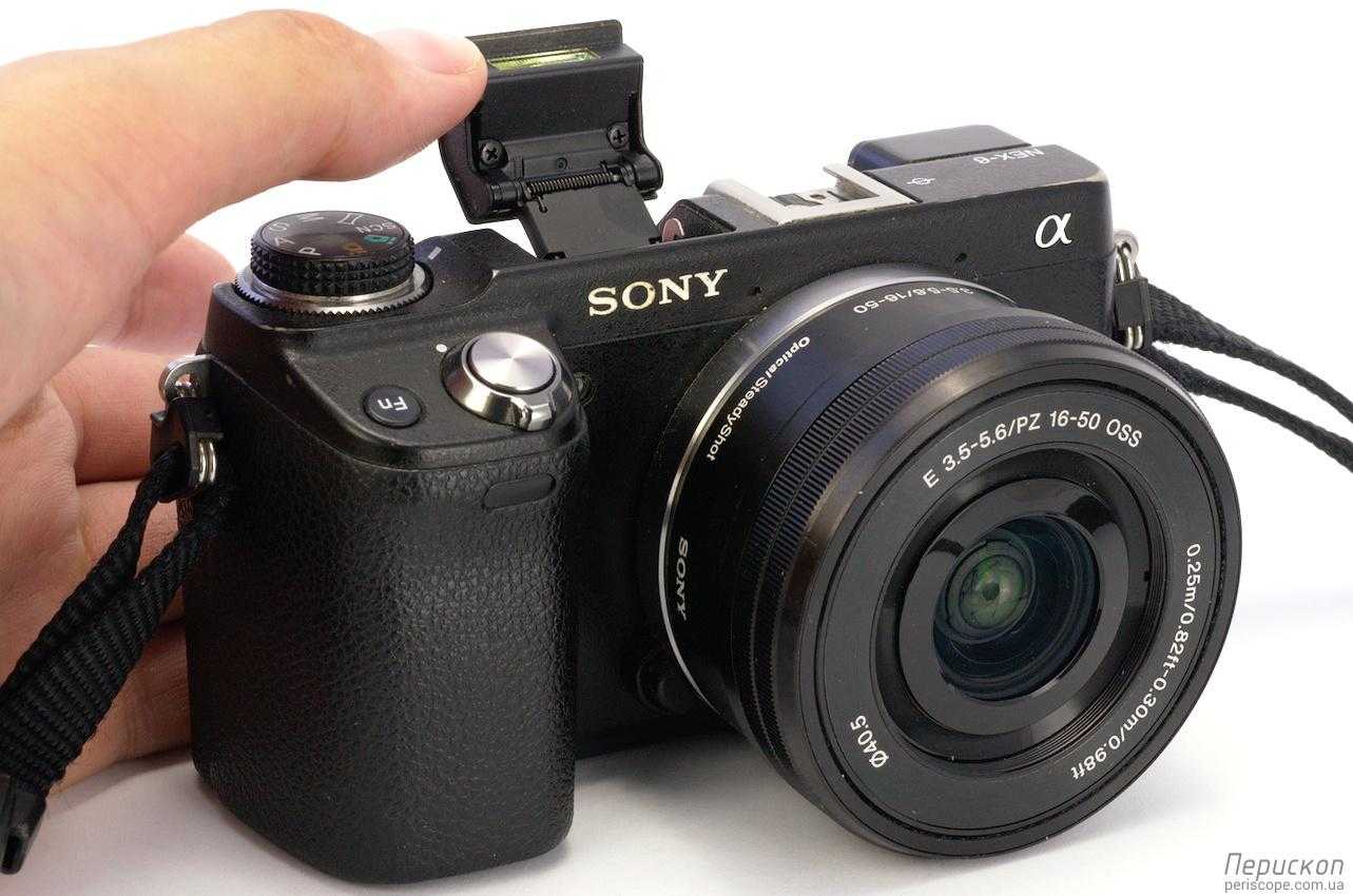 Sony NEX-6 по габаритам немного больше. Как и в самой продвинутой модели Sony NEX-7, с левой стороны находится OLED-видоискатель высокого разрешения, в центре размещена встроенная небольшая вспышка, присутствует новый «горячий башмак», который может принимать новые мощные вспышки и другие аксессуары (микрофоны, трансмиттеры).