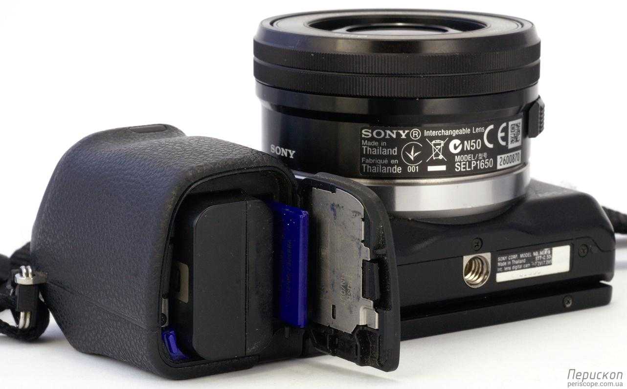 Фотокамера оснащена собственной батареей Sony NP-FW50 7.2V Li-Ion. С автофокусным объективом батареи хватает до двух репортажных съемок, т. е. садится быстрее, чем с мануальным объективом. В основном хватает на 250-300 снимков. Заряжается камера от сетевого адаптера через USB-выход, или внешним зарядным устройством. Батарея в камере фиксируется от выпадения синим стопором.