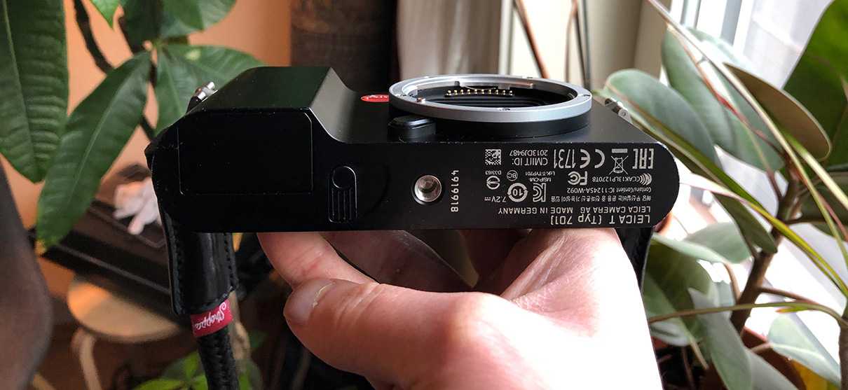 | The T’s decidedly sparse design extends to its baseplate, which is more-or-less plain metal. There aren’t embellishments at all — just the battery compartment and release catch, and the noticeably off-center tripod socket. The unconventional, but eminently sensible battery design is borrowed from the Leica S medium format SLR. There’s no battery door; instead the battery has an integrated cover that fits flush with the baseplate. |
