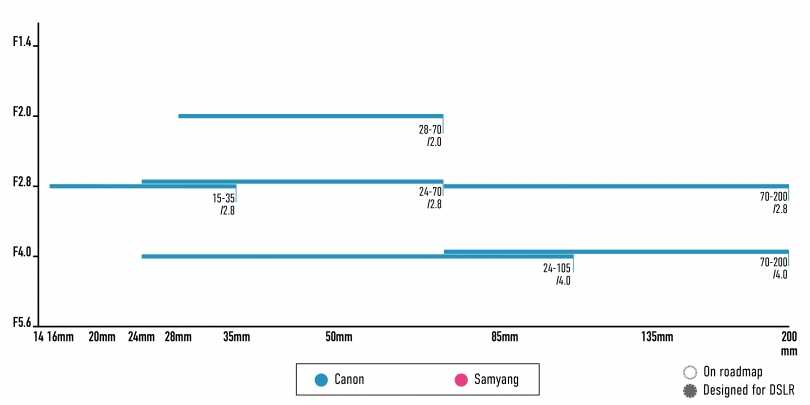 При этом отметим, что первоначальная стратегия расширения Nikon сильно отличается от стратегии Canon: вместо того, чтобы начинать с экзотики, Nikon предоставил ряд сравнительно доступных и портативных объективов с F/1.8, а также набор зумов с F/2.8 и F/4.