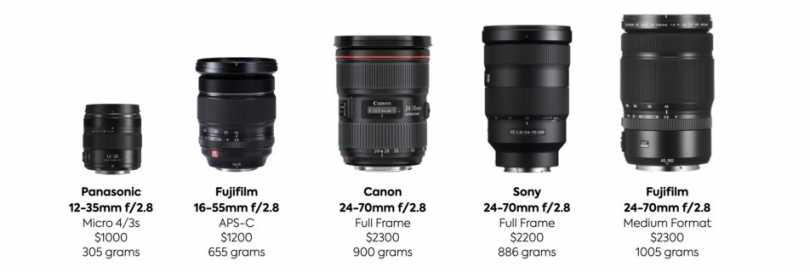 Физические характеристики и цены на объективы обычно, но не всегда, увеличиваются с увеличением размера сенсора. Здесь слишком много вариантов объективов для детального сравнения, поэтому мы сравнили стандартный и наиболее популярный зум-объектив с ФР 24-70 мм (полнокадровый), чтобы дать общее представление о различиях в характеристиках объективов для разных размеров сенсоров. На изображении ниже показаны размеры, вес и сравнение цен на эти объективы.