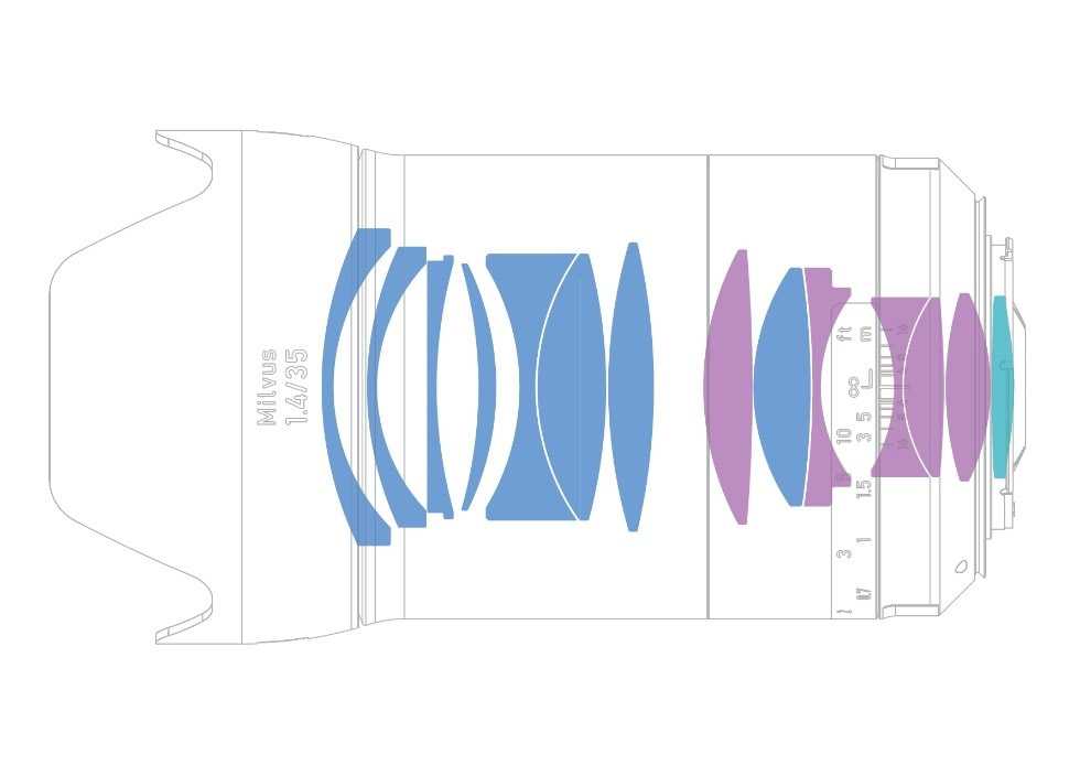 У ZEISS Distagon T✻ 35mm ƒ/1.4 был один элемент и один низкодисперсионный, а в ZEISS Milvus 35/1.4 количество низкодисперсионных элементов стало равно пяти. Это должно очень положительно сказаться на характеристиках.