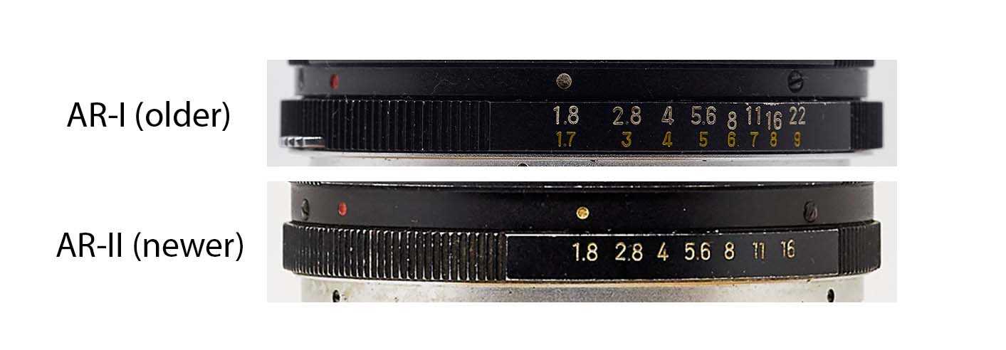 - Aperture ring without half-stops or with half stops at 1:1.8-8 or with half stops at 1:1.8-5.6
