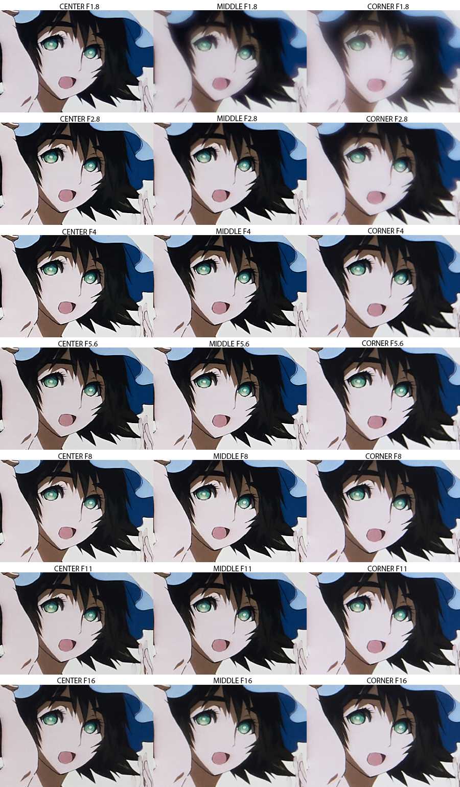 - The test was repeated for every F-stop on every focus position with manual focus adjustment for each shot. That is to avoid the effect of field curvature.