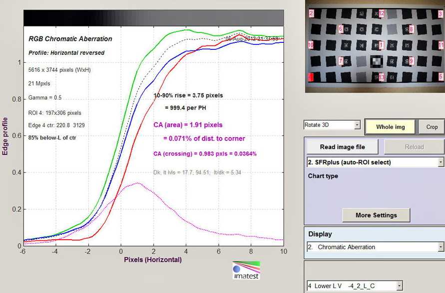 Присутствуют на всех значениях диафрагмы, но мешают только на f/2.0, где их ширина на краях кадра достигает 1,9 пикселя. С прикрытием диафрагмы уровень ХА снижается до комфортных значений ниже 1 пикселя. Поведение схоже с Canon EF 35/1.4, который проигрывает в абсолютных цифрах на полностью открытой диафрагме.