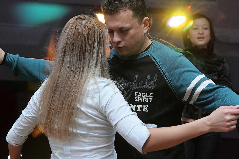 Фото 9. В танцевальном клубе я работал со вспышкой, направленной в противоположную от объектов съемки стену. Высокая чувствительность позволила сохранить световое оформление зала, объектив с высокой светосилой и система автофокусировки помогли точно навестись на резкость в темном помещении. Удивительно, но цветные источники света не помешали камере точно установить цветовую температуру снимка в режиме «Авто». (Объектив Canon EF 28 mm f/1.8 USM, ISO 1600, 1/60 с, f/3,5)