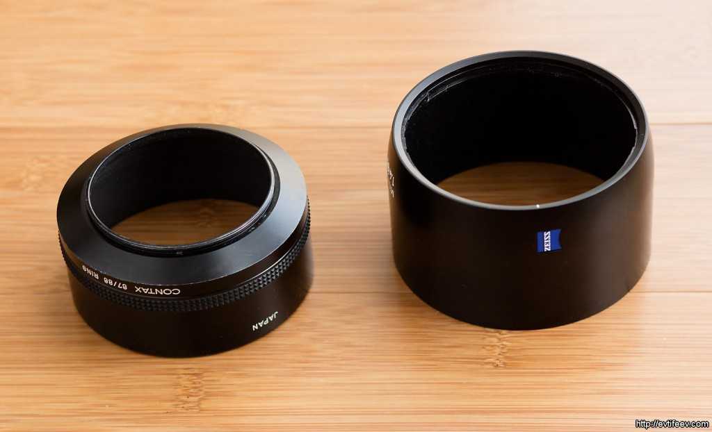 На фото слева старинная резьбовая бленда Carl Zeiss, которую я использую чаще всего, справа бленда от объектива ZEISS Milvus 85/1.4.