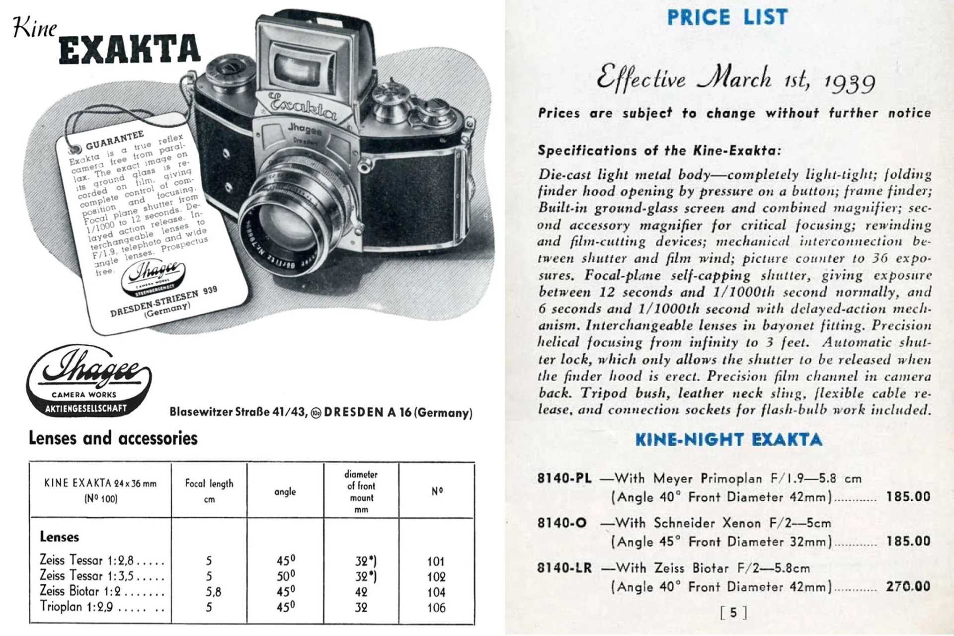 The Kine EXACTA camera, which started being produced in 1936, and the Carl Zeiss Biotar 58mm f2 lens as kit lens