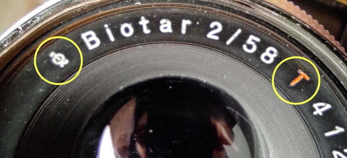 The tested Carl Zeiss Jena Biotar 58mm f2 lens has the quality label Q1 (left) meaning “Very good quality, above the average” and a red T label (right) for a Zeiss T coating (T stands for transparency).
