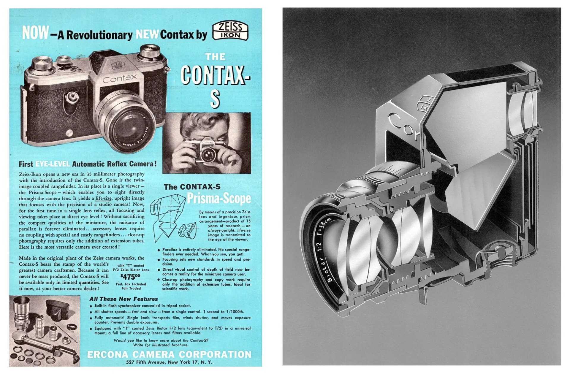 In 1949, Carl Zeiss released the world’s first 35mm SLR camera with an eye-level prism viewfinder and exchangeable lenses, the Contax S camera with the Biotar 58mm f2 as kit lens