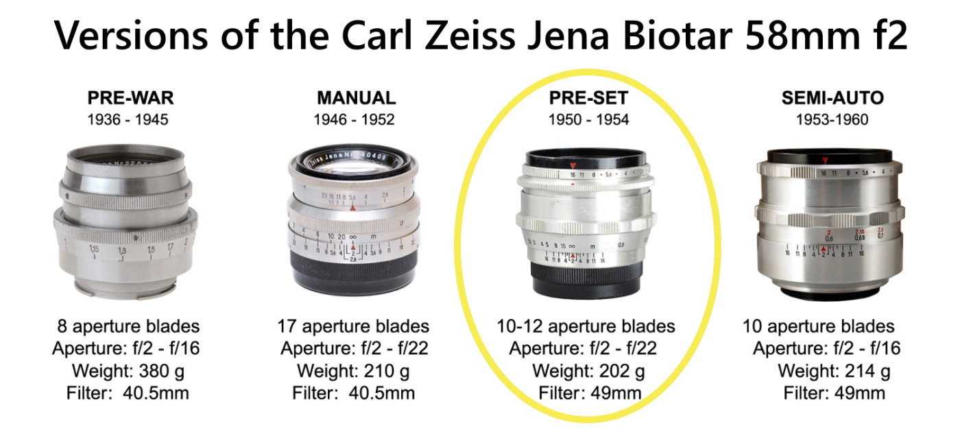 Versions of the Carl Zeiss Jena Biotar 58mm f2 lens; tested was the PRE-SET version made in 1953