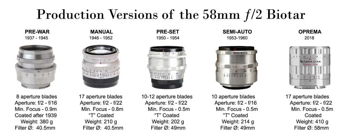 Versions of the Carl Zeiss Jena Biotar 58mm f2 lens; tested was the PRE-SET version made in 1953