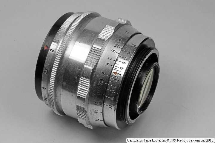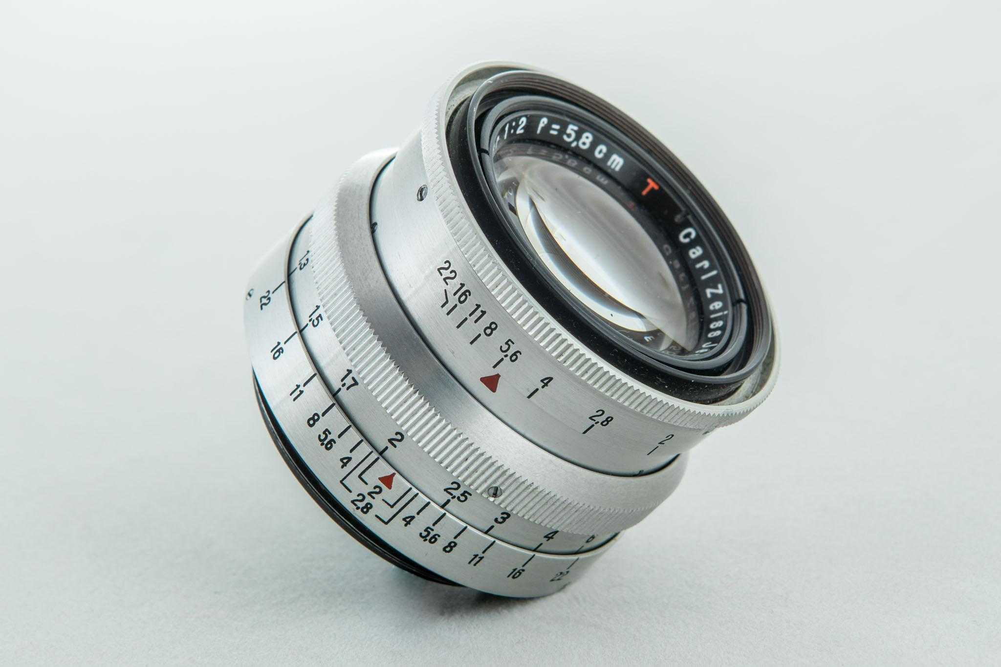 The early version of the Carl Zeiss jena Biotar 2/58 have either an all black finish with white engravings and red markings or a silver finish. These lenses are very rare, especially in good condition. Coated lenses are marked with a red T. There is no preset setting. The lens barrel is slimer compared to the later versions of the lens. Besides being much more compact than later Biotar lenses, these early models differ from later versions due to different reasons: