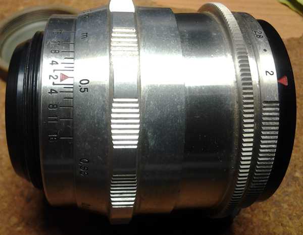 The second generation of the Biotar is a bit bigger and wider. The lens now as a preset setting to control the aperture. The first versions of the preset lens have black stripes on the aperture ring. Focal length is marked in mm (instead of cm).