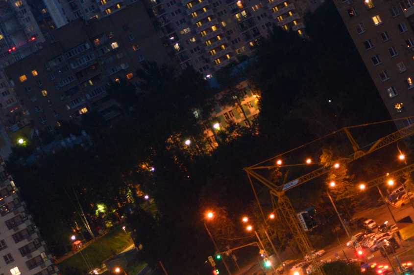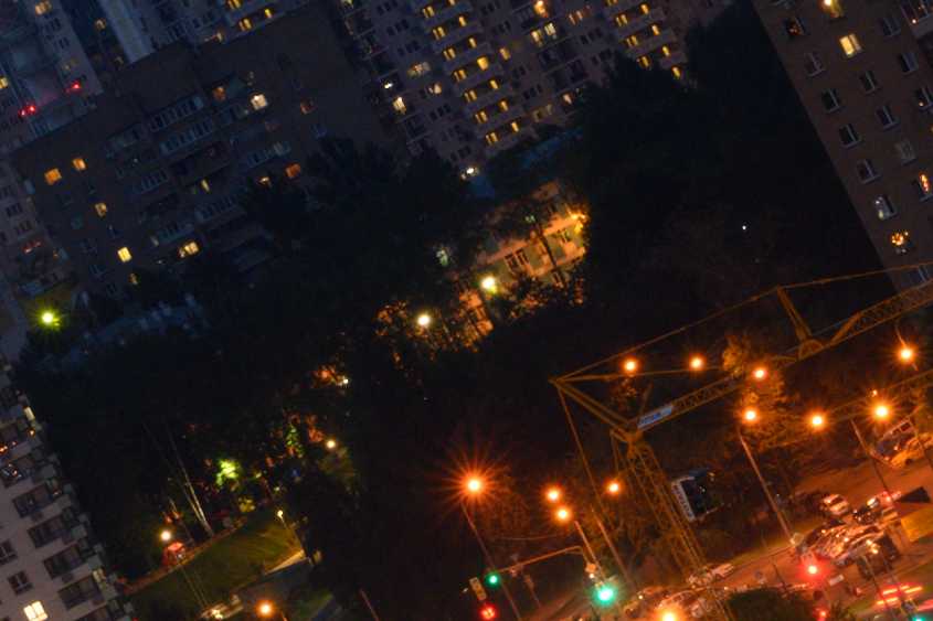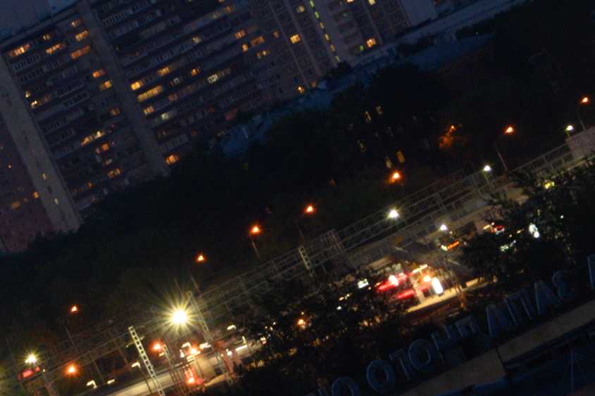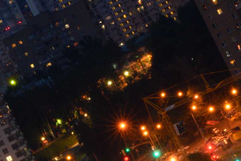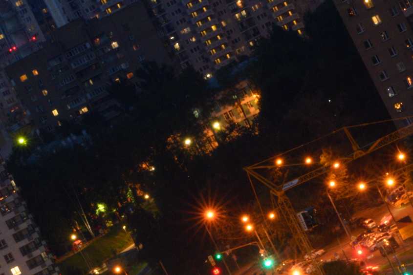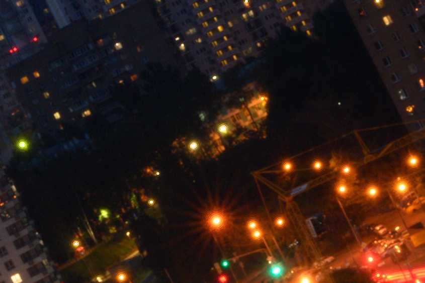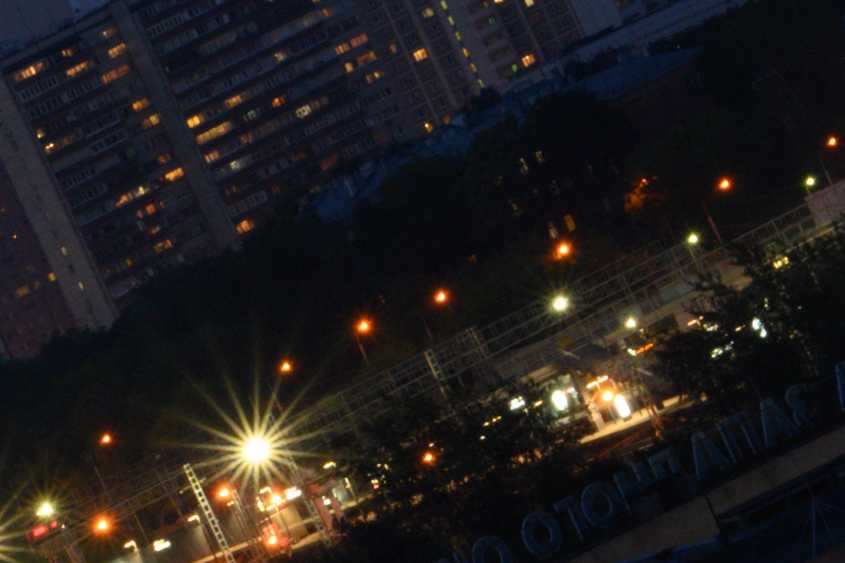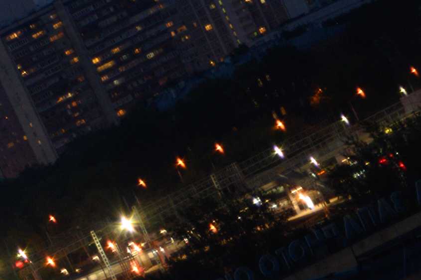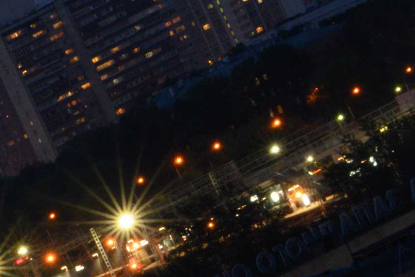 Коматические аберрации и астигматизм проявляются в виде искажения световых точек. Это актуально при съёмке звёзд или ночного города. Кома проявляется на периферии кадра и исправляется диафрагмированием, а астигматизм, как правило, ближе к центру на всех значениях апертуры. Итак, смотрим, справа кома, слева – астигматизм: