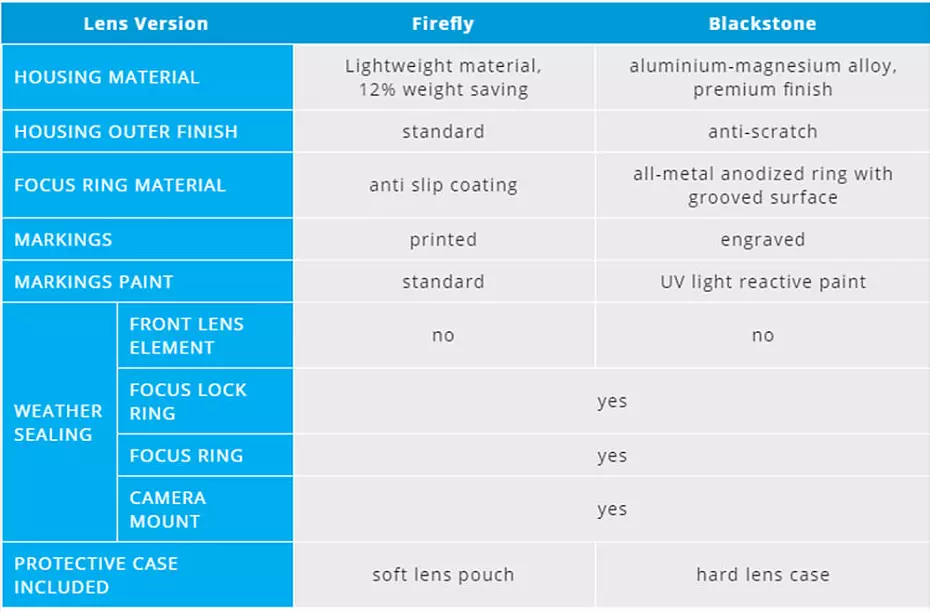 Firefly and Blackstone versions use the same optics and the same precision, but this table, from the Irix website, summarises the differences.