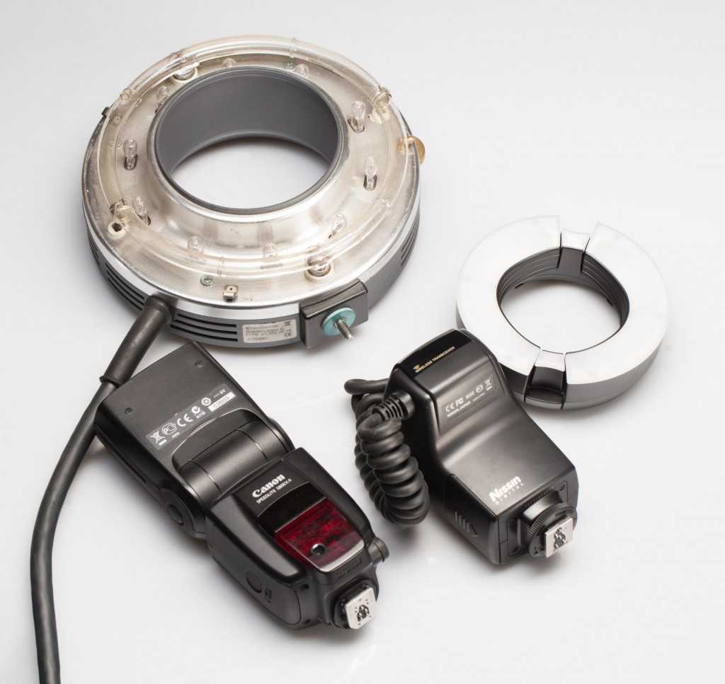 на фото: большая кольцевая вспышка вверху, накамерная вспышка Canon слева внизу, макро вспышка Nissin MF18 Macro справа внизу