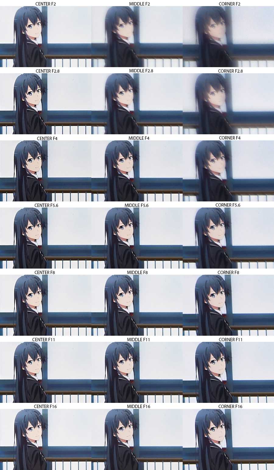 - The test was repeated for every F-stop on every focus position with manual focus adjustment for each shot. That is to avoid the effect of field curvature.
