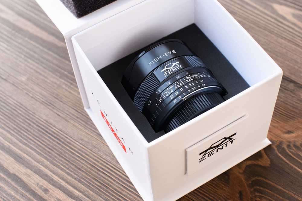 Упаковка Зенитар 2,8/16 имеет современный дизайн и выполнена из плотного картона. Внутри коробки, в ложе из вспененного материала, лежит сам объектив с двумя крышками, а рядом — инструкция.